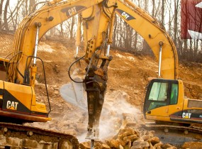 To learn more about our fleet, click here for available equipment list. Likewise, we invite you to review the working gallery below! Featured equipment includes: CAT 815 Smooth Drum Roller; CAT 740 Rock Truck; CAT 315B and CAT 330C Excavators (with Hammers); CAT 740 Rock Truck; CAT 315B Excavator; CAT D400 Rock Truck; CAT 315B Excavator and Metso LT 105 Rock Crusher; CAT D6N Dozer; CAT 8254 Sheeps Foot Dozer. Please contact Allegheny Excavating offices for full equipment list and estimates.